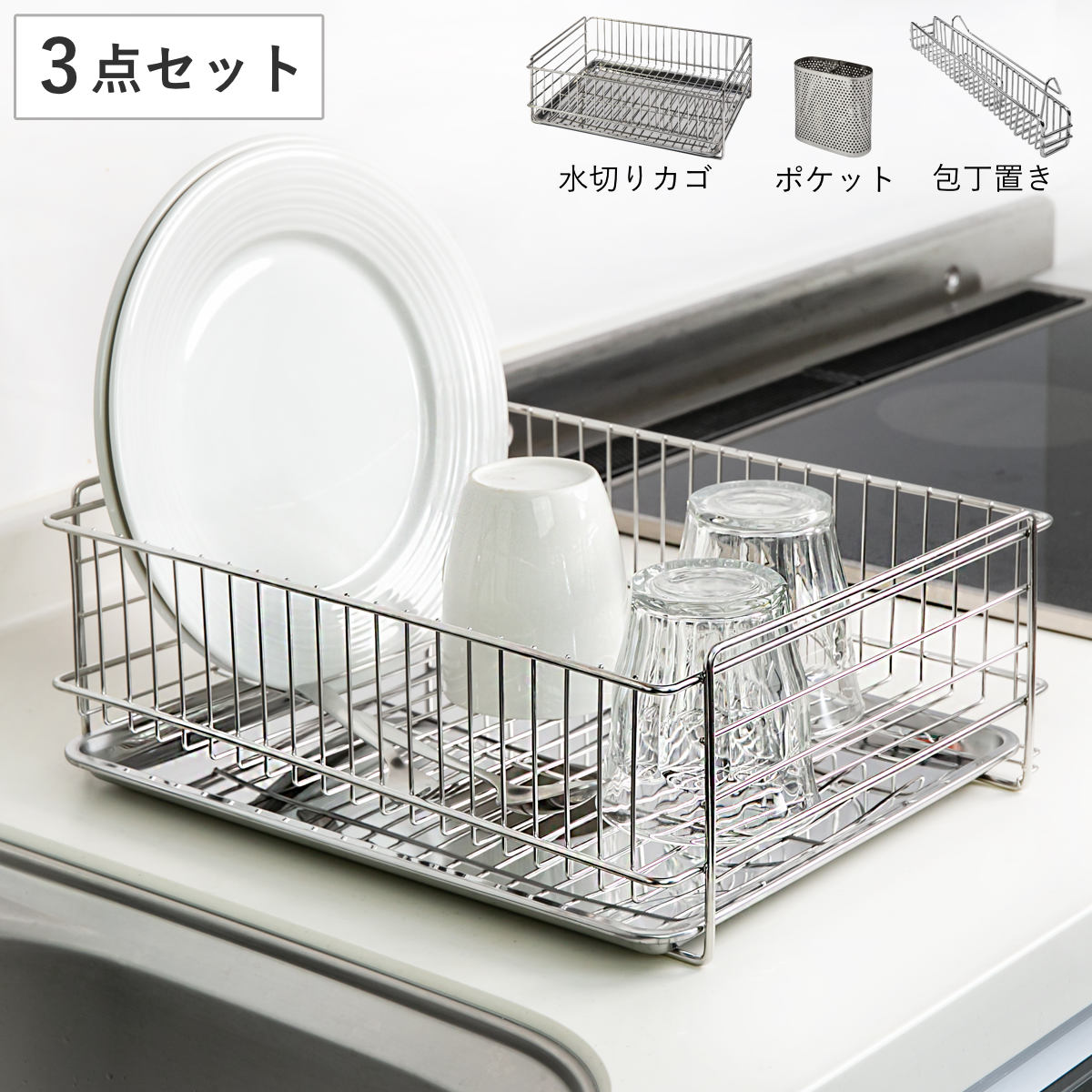 水切りラック 3点セット ステンレス 水切りカゴ ポケット 包丁置き ( カトラリースタンド 包丁スタンド 水切り ステンレス製 アットアクア 水切りかご 水切りバスケット カトラリーポケット スタンド 包丁立て 包丁差し )