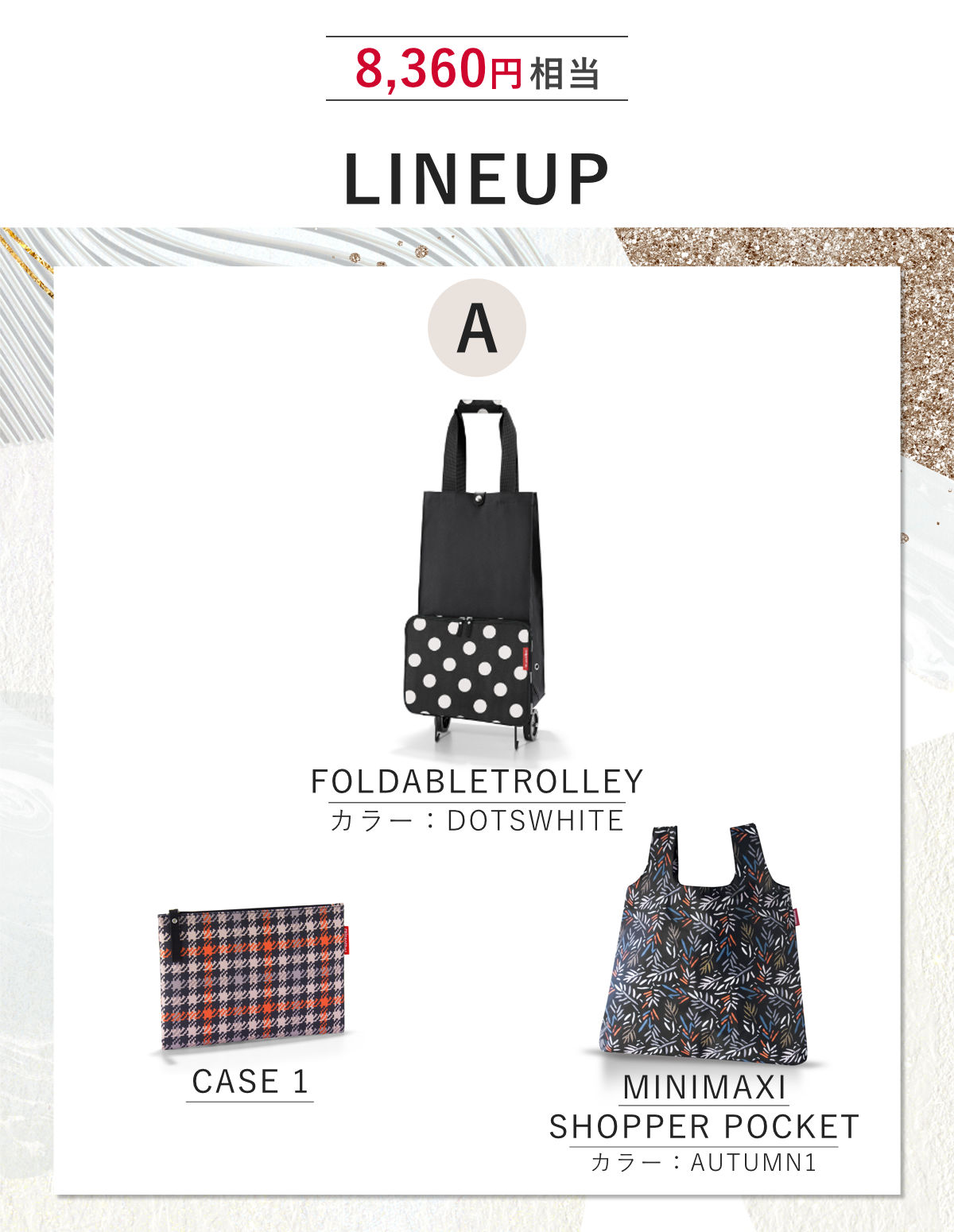人気のショッピングカート「FOLDABLETROLLEY」+ポーチ・エコバッグがセットになった、旅行にうれしいお出かけ3点セット。総額8360円相当の商品が5000円とお得な福袋です。