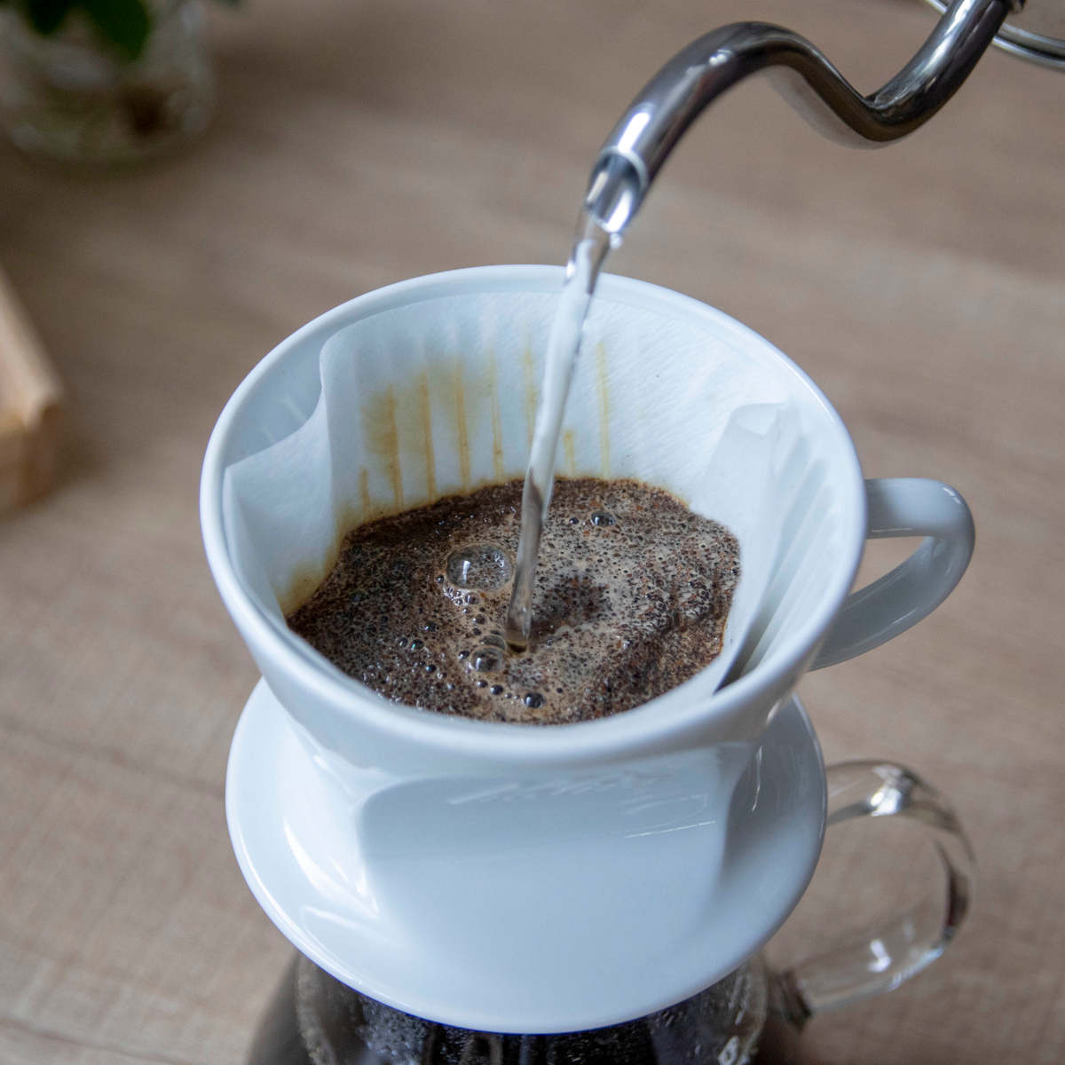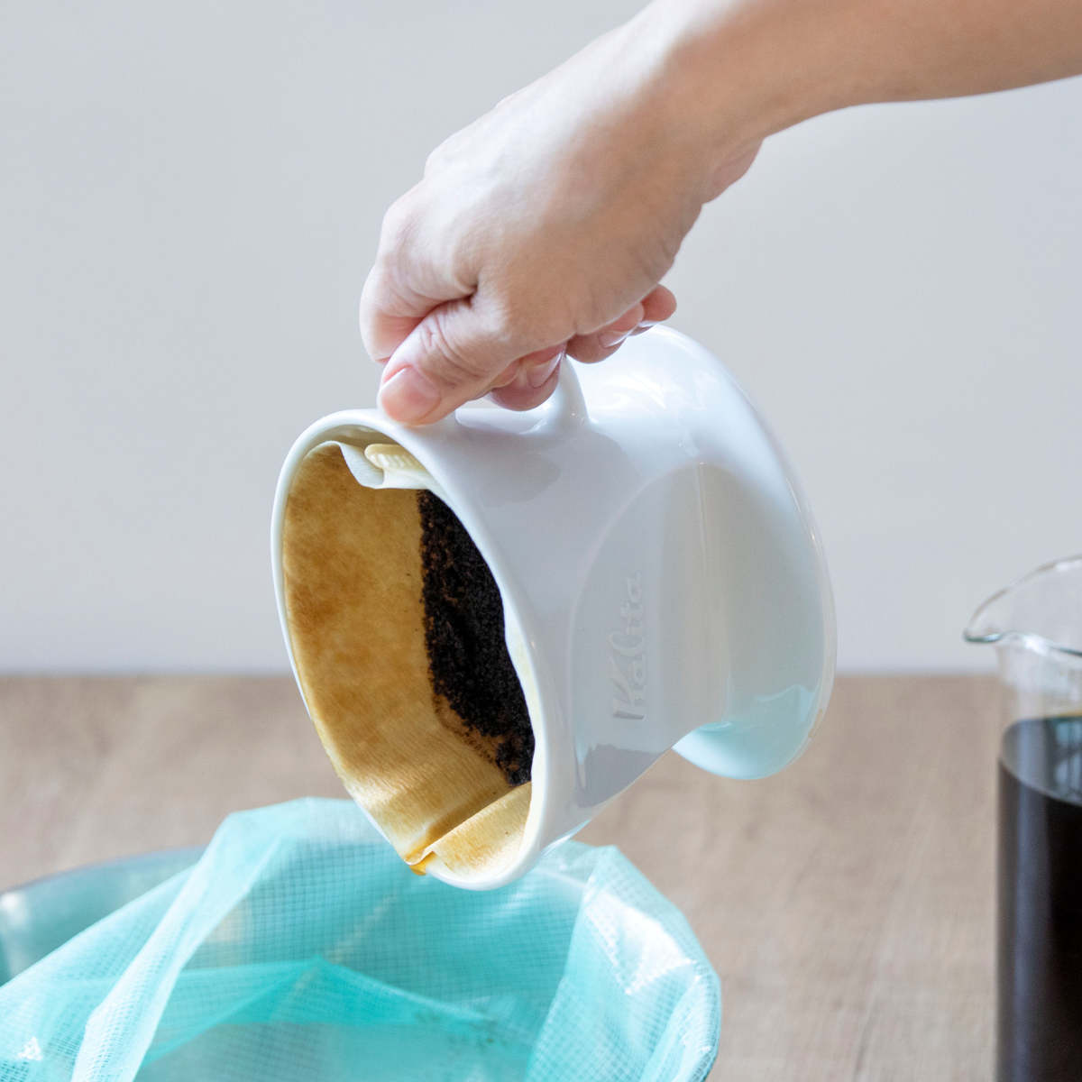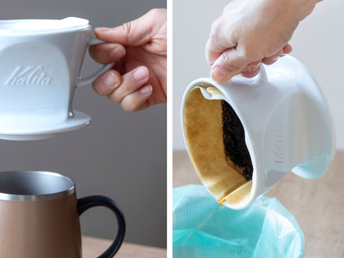 持ちやすい形状の持ち手付きです。抽出後は、スムーズに取り外せてドリッパーに直接触れずに済むため、火傷の心配もありません。抽出後は、濾紙ごとゴミ箱にポンと入れるだけなので後始末が簡単です。