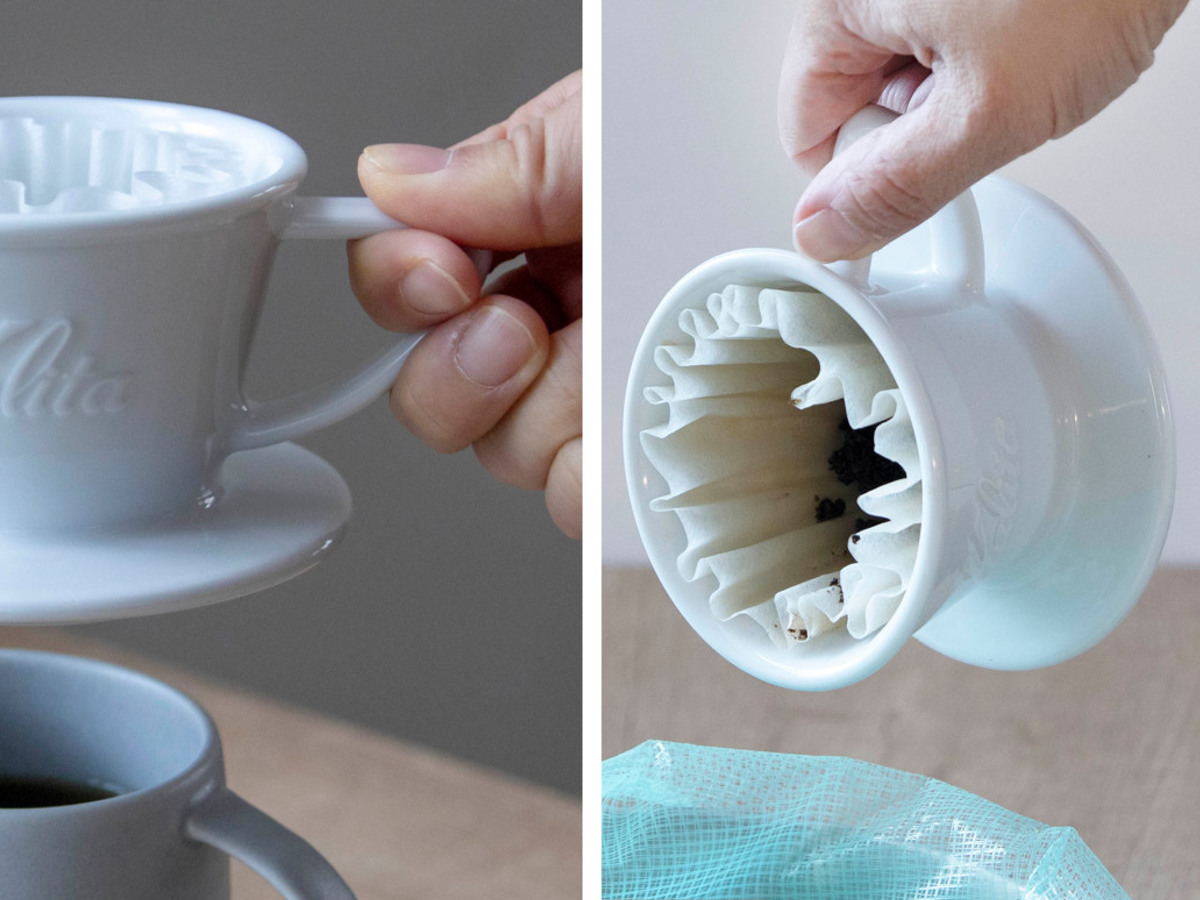 持ちやすい形状の持ち手付きです。抽出後は、スムーズに取り外せてドリッパーに直接触れずに済むため、火傷の心配もありません。抽出後は、濾紙ごとゴミ箱にポンと入れるだけなので後始末が簡単です。