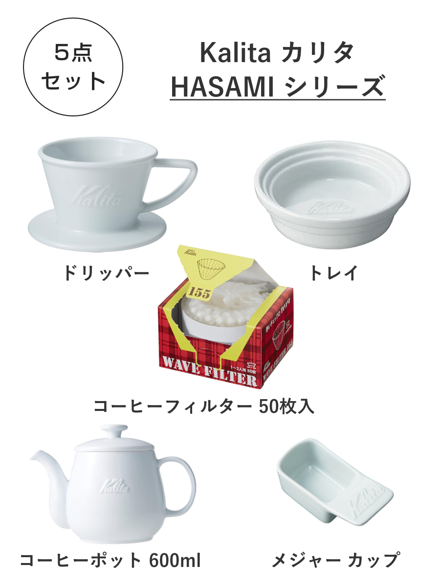 | 内容量 | 5点セット (HA155 ドリッパー ウェーブ、HA トレイ、HA コーヒーポット 600ml、HA メジャー カップ×各1個、コーヒーフィルター KWF-155×50枚) |