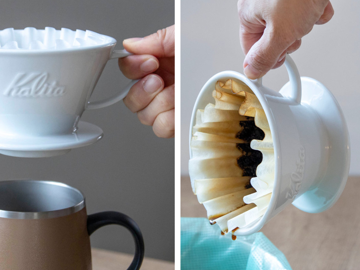 持ちやすい形状の持ち手付きです。抽出後は、スムーズに取り外せてドリッパーに直接触れずに済むため、火傷の心配もありません。抽出後は、濾紙ごとゴミ箱にポンと入れるだけなので後始末が簡単です。
