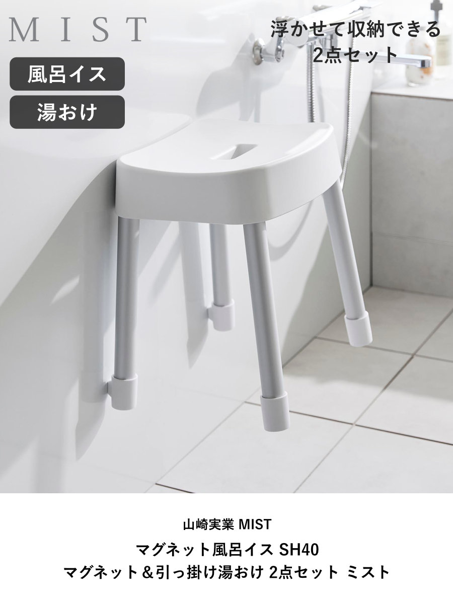 山崎実業 MIST マグネット風呂イス SH40+マグネット&引っ掛け湯おけ 2点セット ミスト ( 4903208103756 バスチェア 座面高40cm 湯桶 洗面器 壁面 浮かせる ホワイト ブラック ) 【ホワイト】