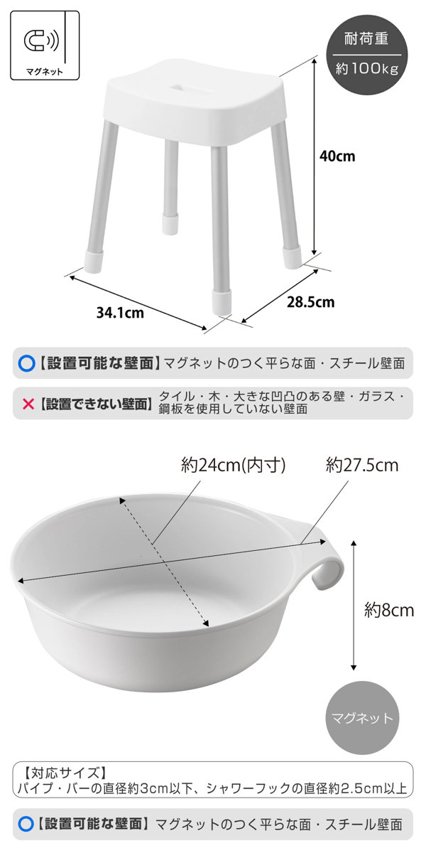 | 備考 | 【風呂イス】 取り付け可能な壁面:マグネットがつく平らな面・スチール壁面 |