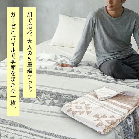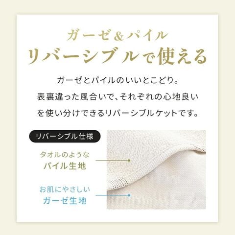 | ・表はふんわりガーゼ生地 やわらかくふんわりと気持ちの良い肌触り。吸水性に優れているため、寝ている間にかいた汗を優しく吸収。寝汗による寝冷えを防いでくれます。 ・贅沢な5重織り5層にした繊細なガーゼは空気の層をたくさん含むため、熱を溜めて適度な保温に。エアコン対策や季節の変わり目におすすめです。 ・裏はふっくらパイル生地裏面は適度な弾力性と通気性を兼ね備えたふっくら柔らかなパイル生地。吸水性も抜群なので夏の暑い夜もサラッと快適にお過ごしいただけます。 ・ガーゼ&パイル リバーシブルで使えるガーゼとパイルのいいとこどり。表裏違った風合いで、それぞれの心地良いを使い分けできるリバーシブルケットです。 ・お肌にやさしい綿100%素材天然素材の綿100%仕上げ。寝汗や湿気を良く吸い取り、快適な寝心地を作ります。 ・オールシーズン使える高い保温性をもつ天然コットンだから、季節や好みに合わせてお肌に触れる面を変えて1年中快適にお使いいただけます。 ・今治タオルブランド認定商品このマークは、日本最大のタオル産地「今治」で、独自の品質基準に合格したタオルのみに付与されます。 ・タオルソムリエが選定当店のタオルは専門資格「タオルソムリエ」を持つスタッフが選定しています。専門的な知識を元に選ばれた上質なタオルです。 ・洗濯機で丸洗いOK!汚れても洗濯機で丸洗いOK。お洗濯後もふっくらやわらかさがキープされるので、赤ちゃんやデリケートなお肌にも安心してご使用いただけます。 ・キリム柄デザインエスニックなサンタフェモチーフのキリム柄デザインです。 | |
