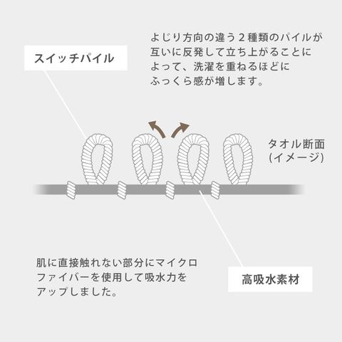 スイッチパイルという特別な織り方のパイルでできたこのタオルは、洗うたびにタオルの糸が空気を含み、ふっくら膨らむと、吸水性や速乾性も高くなっていきます。