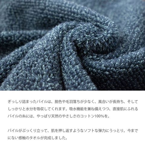 ぎっしり詰まったパイルは、脱色や毛羽落ちが少なく、風合いが長持ち、そしてしっかりと水分を吸収してくれます。