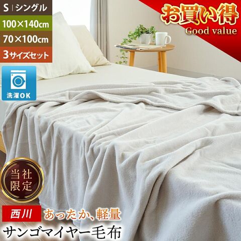 【お得で便利な3サイズセット】毛布 シングル 西川 サンゴマイヤー 140×200cm シングル 100×140cm ハーフサイズ 70×100cm ひざ掛け (ライトグレー)【10C-BQ75-SETLGY】