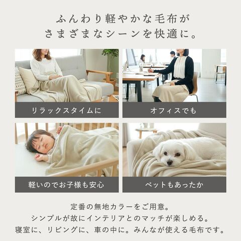 | ・ふんわりとしたサンゴマイヤー生地 極細繊維を両面起毛させているから、思わず頬ずりしたくなるようなふわふわタッチ。空気をたっぷり含む構造なので、体温で温められた空気を逃しにくいため、高い保温性があります。 ・年中使いやすい軽量タイプ厚手の毛布ほど重たくなく、春先や秋口にも快適。冷えやすい方なら夏の冷房対策にもおすすめ。使わない時期はコンパクトに収納できて使い勝手がよいのもオススメポイントです。 ・ふんわり軽やかな毛布がさまざまなシーンを快適に。リラックスタイムに、オフィスでも、軽いのでお子様も安心、ペットもあったか。シンプルな無地カラーをご用意。インテリアとのマッチが楽しめる。寝室に、リビングに、車の中に。みんなが使える毛布です。 ・安心で高品質の西川製西川株式会社は、1566年創業の日本有数の寝具メーカー。よい睡眠を追求するため、培った伝統や技術を活かし、最新の技術も取り入れながら新しい商品を創造しています。眠りや寝具への強いこだわりが、品質の高さに繋がっています。 ・洗濯機で手軽に洗える乾きやすいポリエステル素材だから冬のお洗濯も安心。ご家庭で丸洗いできて、毎日清潔にお使いいただけます。 | |