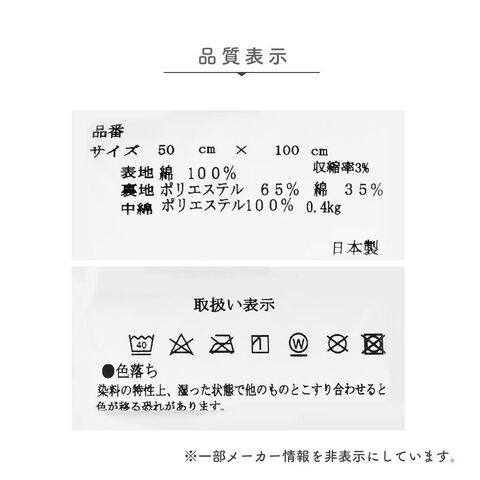 | 組成 | 表地:綿 100% 裏地:ポリエステル 65% 綿 35% 中わた:ポリエステル100% |