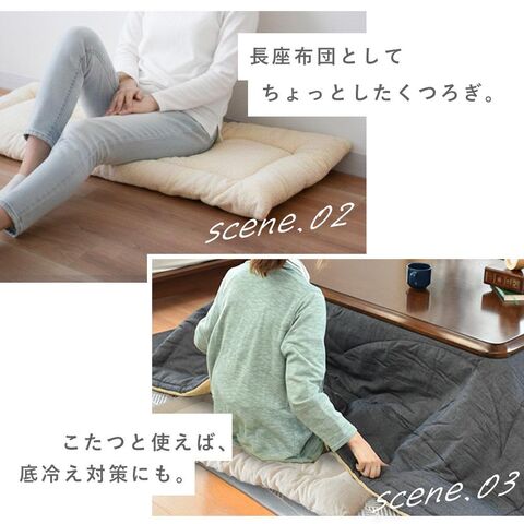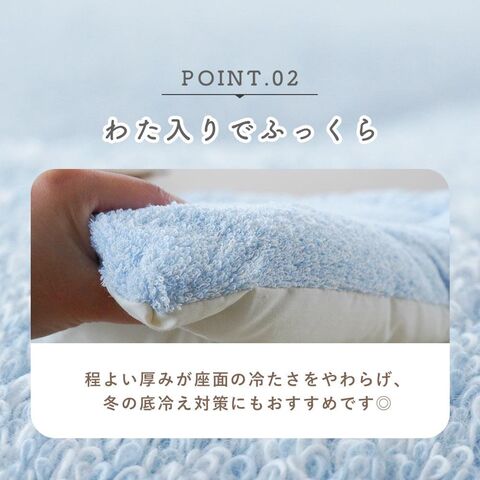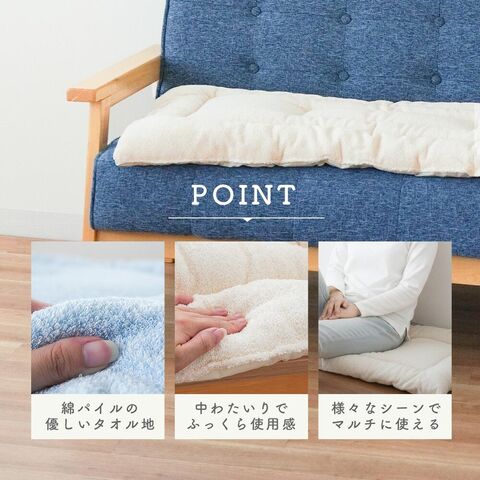 | ・タオル仕様のパイル素材! 表面は、タオル仕様のふんわりパイル。素肌に触れてもチクチクしない優しい触れ心地で、季節を問わず快適な使い心地です。 ・中わた入りでふっくら♪長時間座っても疲れにくい、程よい厚みのわた入りで、座面の冷たさをやわらげ、寒い季節の底冷え対策にもおすすめです。 ・マルチに使える便利なクッションソファクッションとしてはもちろん、フローリングやイスに敷いて長座布団のように使用したり、車の座席に敷くのも◎ソファのヘタリやイメージを変えたい時にもおすすめです! | |