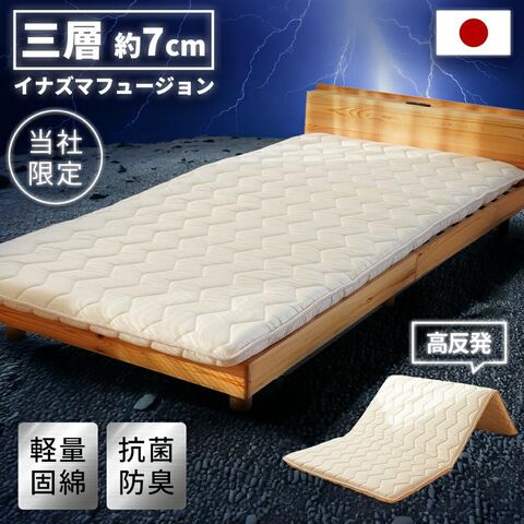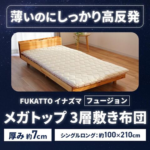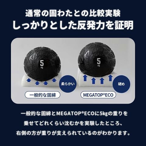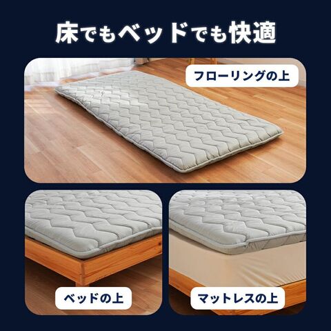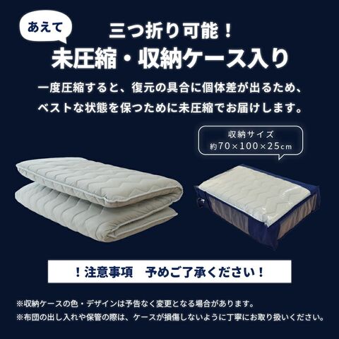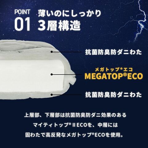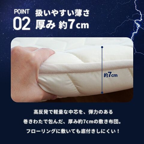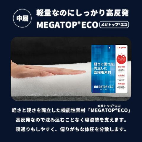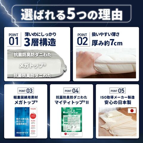 | ・薄いのにしっかり3層構造 上層部、下層部は抗菌防臭防ダニ効果のあるマイティトップ(R)2 ECOを、中層には固わたで高反発なメガトップ(R)ECOを使用。 ・軽量なのにしっかり高反発MEGATOP(R)ECO軽さと硬さを両立した機能性素材「MEGATOP(R)ECO」高反発なので沈み込むことなく寝姿勢を支えます。寝返りもしやすく、偏りがちな体圧を分散します。 ・扱いやすい薄さ 厚み約7cm高反発で軽量な中芯を、弾力のある巻きわたで包んだ、厚み約7cmの敷き布団。フローリングに敷いても底付きしにくい! ・抗菌防臭・防ダニわた使用マイティトップ(R)2 ECO高い忌避効果を発揮し、ダニを寄せにくくします。細菌の増殖を抑制し、防臭効果を発揮します。皮膚刺激性試験など、様々な試験で安全性を確認。 ・SEKマークを取得SEKマークとは、繊維製品新機能評価協議会が、抗菌防臭などの機能性を持つ繊維製品の品質を保証する認証マークです ・ISO 9001 取得メーカー 安心の日本製「ISO 9001」は国際標準化機構の定める顧客満足のための国際標準規格です。そんなISOを取得した信頼性の高いメーカー製です。 ・三つ折り可能!未圧縮・収納ケース入り一度圧縮すると、復元の具合に個体差が出るため、ベストな状態を保つために未圧縮でお届けします。 | |