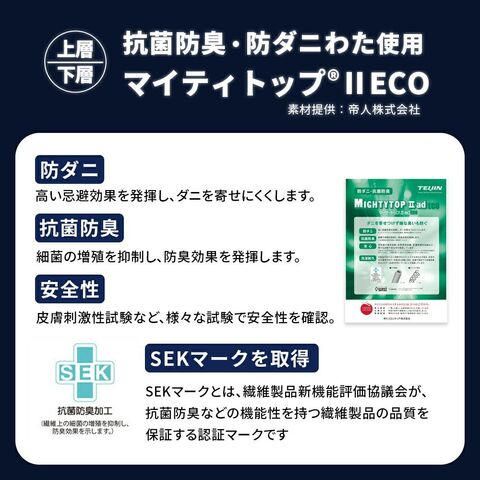 | 仕様 | 高機能中わた:メガトップ(R)ECO 抗菌防臭防ダニわた:マイティトップ(R)2 ECO 使用 |