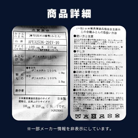 | 組成 | 側地:ポリエステル100% 巻きわた:ポリエステル100% 約1.0kg 中芯:ポリエステル100% (ウレタンフォーム入り) 約3kg |