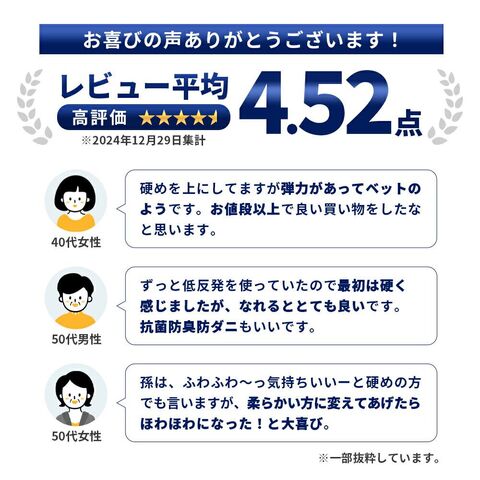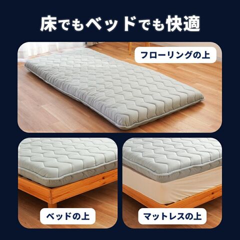 | ・2種類の硬さが楽しめるリバーシブルタイプ 表面はふかふかとした凸凹ウレタン、裏面はしっかりと身体を支えるフラットな固綿タイプとなっております。ひっくり返すだけで簡単に寝心地を変えることができます。 ・体圧分散効果のあるプロファイルウレタン厚み5cmの凸凹ウレタンが身体を点で支えることで過剰な沈み込みを抑え、よりよい寝姿勢に。体圧を分散し、毛細血管の圧迫を抑制します。 ・軽量なのにしっかり高反発MEGATOP(R) ECO軽さと硬さを両立した機能性素材「MEGATOP(R) ECO」高反発なので沈み込むことなく寝姿勢を支えます。寝返りもしやすく、偏りがちな体圧を分散します。 ・厚み約11cmの超ボリューム!極厚4層で底付きにくい異なる素材2種類の中芯を、弾力のある巻きわたで包んだ、厚み約11cmの超ボリューム敷き布団。フローリングに敷いても底付きしにくい! ・抗菌防臭・防ダニわた使用マイティトップ(R)2 ECO高い忌避効果を発揮し、ダニを寄せにくくします。細菌の増殖を抑制し、防臭効果を発揮します。皮膚刺激性試験など、様々な試験で安全性を確認。 ・SEKマークを取得SEKマークとは、繊維製品新機能評価協議会が、抗菌防臭などの機能性を持つ繊維製品の品質を保証する認証マークです ・ISO 9001 取得メーカー 安心の日本製「ISO 9001」は国際標準化機構の定める顧客満足のための国際標準規格です。そんなISOを取得した信頼性の高いメーカー製です。 ・三つ折り可能!未圧縮・収納ケース入り一度圧縮すると、復元の具合に個体差が出るため、ベストな状態を保つために未圧縮でお届けします。 | |