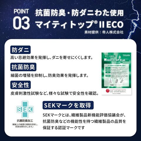 | 仕様 | 高機能中わた:メガトップ(R) ECO 抗菌防臭防ダニわた:マイティトップ(R)2 ECO 使用 |