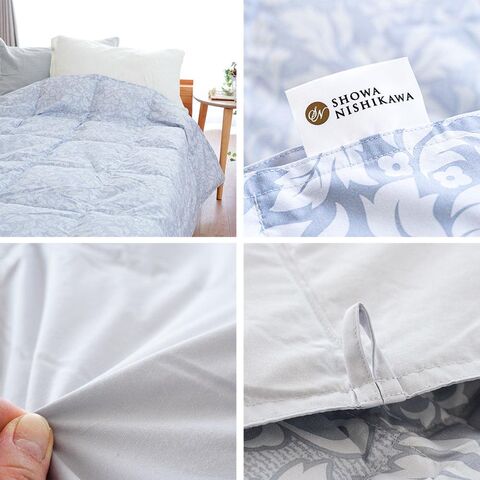 | ・春から夏まで使える薄手のお布団 寒さもやわらいできたころ、そろそろ羽毛布団はあったかすぎる。かといってタオルケットなどの夏物寝具にはまだ早い。そんな季節にぴったりな「春夏の羽毛布団」のダウンケット。 詰め物250gとひかえめなボリューム感。これが間の季節にちょうどいいんです。春の夜中は冷えが気になる…という方にも、暑くなってきたからそろそろエアコンを…という時期でも、眠っている間の体の冷えを防いでくれるから安心です。 ・洗濯機で洗えて清潔お手入れがめんどくさそうなイメージのある羽毛布団ですが、こちらのダウンケットは洗濯機で丸洗いOK!汗をかいたり汚れが気になったらサッと洗って、毎日快適。 また、側生地に抗菌加工を施して、衛生的で安心して使えるダウンケットを目指しました。 ・機能性もしっかり布団を固定するループは8ヵ所付き。 購入前にお使いのカバーのヒモ位置をご確認ください。 (10ヵ所ヒモ付きの布団カバーでも問題なく使用できます。) | |