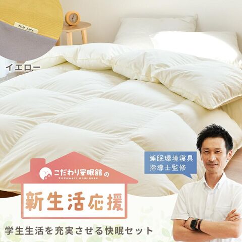 | ・4年間(6年間)の学生生活を充実させる快眠セット 何かと入り用な新生活。予算は限られていますよね・・・。そんな、限られた予算の中で少しでもいいものを!当店の寝具のプロが健康的な毎日を送りたい貴方のためにピックアップ!コスパの高いぐっすり眠れるセットです。 ・創業50周年以上の老舗ふとん屋が選んでいます。当社は地域に根付いた企業として、長年営業してきました。睡眠環境寝具指導士、ピローアドバイザー、などの眠りのプロが多数在籍しており、お客様に安心して良質な寝具をお買い求めいただけるよう日々努めております。 ・国産 ダウン85% 羽毛掛け布団ふんわり、軽くてあったかい羽毛布団。軽くて寝返りも打ちやすいので、体の負担を軽減。暖かいだけでなく吸湿・放湿性にも優れているので、睡眠時の不快感を軽減してくれます。 ・国産 清潔三層敷き布団ながく使える三層構造のしっかりタイプの敷き布団。1枚でも底付き感のない寝心地です。国内工場で製造されているため安心の品質です。側生地はお肌に優しく吸水性の高い綿100%。 ・国産 手洗いできる くぼみわた枕誰もが使いやすいホワイト系のわた入りまくら。真ん中のくぼみが頭部をしっかり安定させます。手洗いできるので清潔に保つことができます。 ・リバーシブル布団カバー3点セットシンプルな無地リバーシブルカラーの布団カバー。カラー展開も豊富で8色からお選びいただけます。シワになりにくく、乾きやすいポリエステル生地。抗菌防臭加工が施されているので安心です。 | |