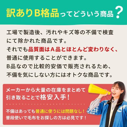 | ・訳ありB格品でも品質は問題なし!おトクに購入できるチャンス 工場での検査時に汚れやキズなどで除外されたB格品ですが、品質はA品とほとんど変わらず、通常使用には問題ありません。不備を気にしない方には非常におトクな商品です。 ・お財布に優しいお買い得毛布メーカーから商品を大量仕入れし、さらに色は当店のおまかせにすることで、仕分けのコストを削減。その結果、お求めやすい価格を実現しました! ・京都の老舗メーカー「ロマンス小杉」製創業70年を超える老舗寝具メーカー「ロマンス小杉」のブランド製品で、寝心地や使い心地を追求した高品質なものづくりが魅力です。 ・ふわっふわで心地よい手触りポリエステル100%の生地があなたをふんわり包み、やわらかなふわふわの肌触りで心も体も温まります。 ・しっかりあったか2枚合わせ毛布2枚の毛布生地を重ねた構造で、空気の層が高い保温力を発揮。1枚以上のボリューム感と暖かさを実現しています。 ・衿付きで首元まであったかふっくらとした衿付き仕様で、首元や肩口の隙間をしっかりカバー。外気を防ぎ、中の暖かさを逃しません。 ・手洗いでお洗濯OK手洗い推奨ですが、自宅での洗濯が可能で、清潔に使い続けられます。 | |