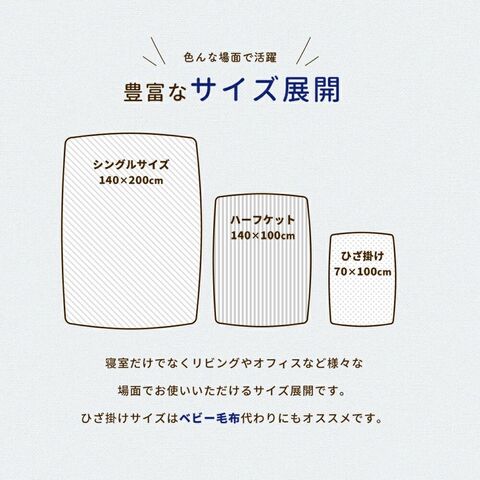 寝室だけでなくリビングやオフィスなど様々な場面でお使いいただけるサイズ展開です。ひざ掛けサイズはベビー毛布代わりにもオススメです。