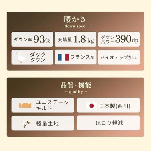 | 仕様 | フランス産ダックダウン | |||