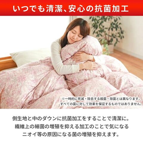 側生地と中のダウンに抗菌加工をすることで清潔に。繊維上の細菌の増殖を抑える加工のことで気になるニオイ等の原因になる菌の増殖を抑えます。※一時的に死滅・除去する殺菌・除菌とは異なります。すべての菌に対して効果を保証するものではありません。