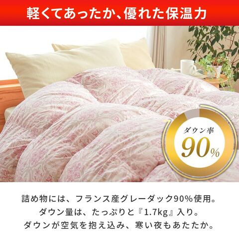 詰め物には、フランス産グレーダック90%使用。ダウン量は、たっぷりと『1.7kg』入り。ダウンが空気を抱え込み、寒い夜もあたたか。