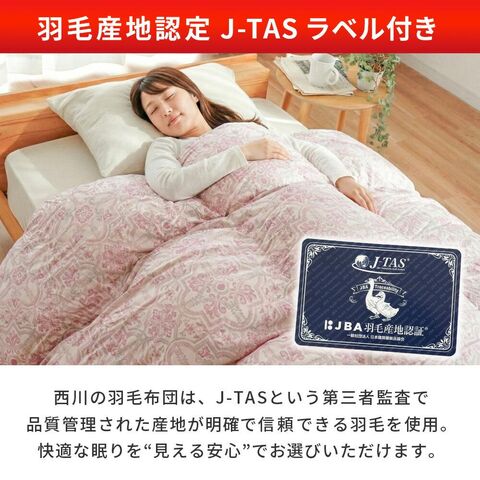西川の羽毛布団は、J-TASという第三者監査で品質管理された産地が明確で信頼できる羽毛を使用。快適な眠りを“見える安心”でお選びいただけます。