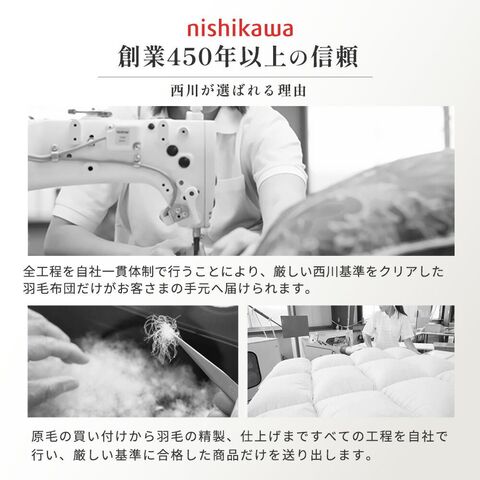 全工程を自社一貫体制で行うことにより、厳しい西川基準をクリアした羽毛布団だけがお客さまの手元へ届けられます。原毛の買い付けから羽毛の精製、仕上げまですべての工程を自社で行い、厳しい基準に合格した商品だけを送り出します。
