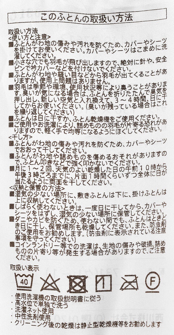 | 組成 | 側生地: ポリエステル85% 綿15% 詰め物(ホワイトダック) ダウン85% フェザー15%(合計300g) |