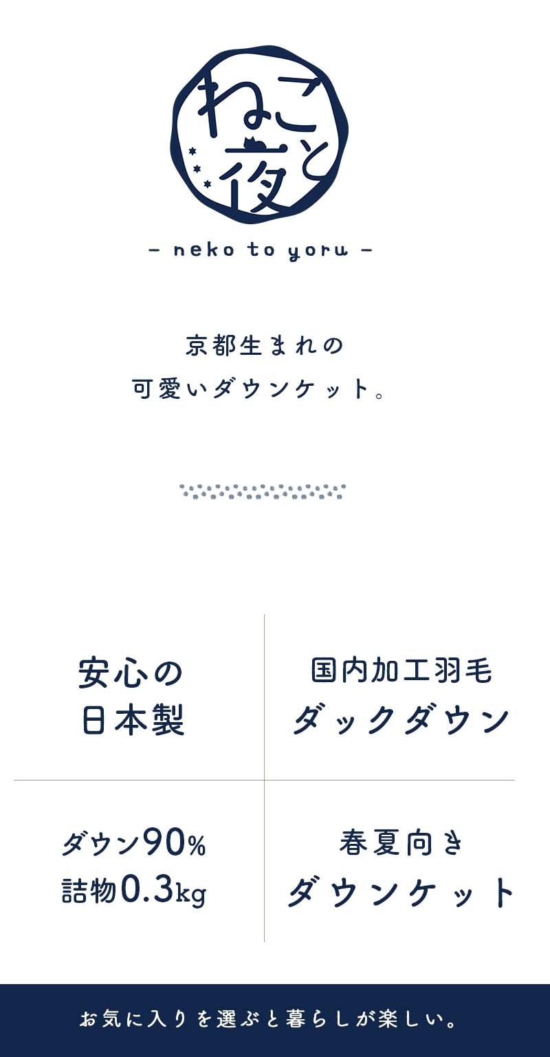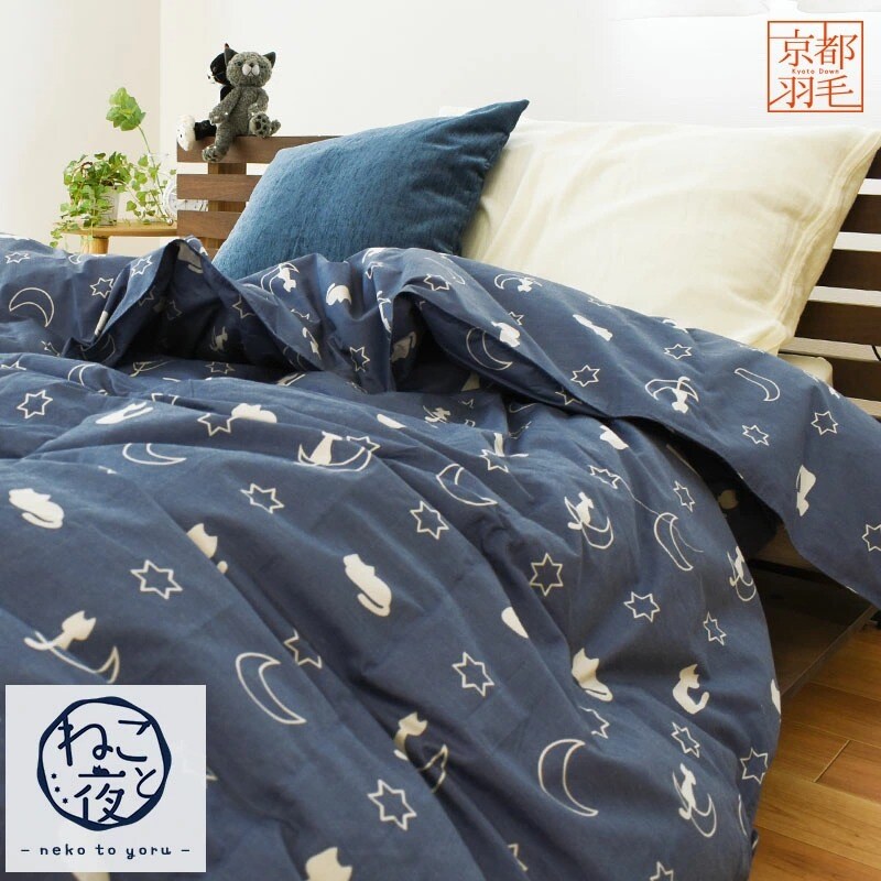 ダウンケット シングル ネコ柄 京都職人 ホワイトダックダウン 90% 0.3kg 350dp以上 日本製 京都羽毛 肌布団 肌掛け 猫柄 「ねこと夜 neko to yoru」 立体キルト 夏用 かわいい(150×210cm ネイビー)【3S-2183SNV】