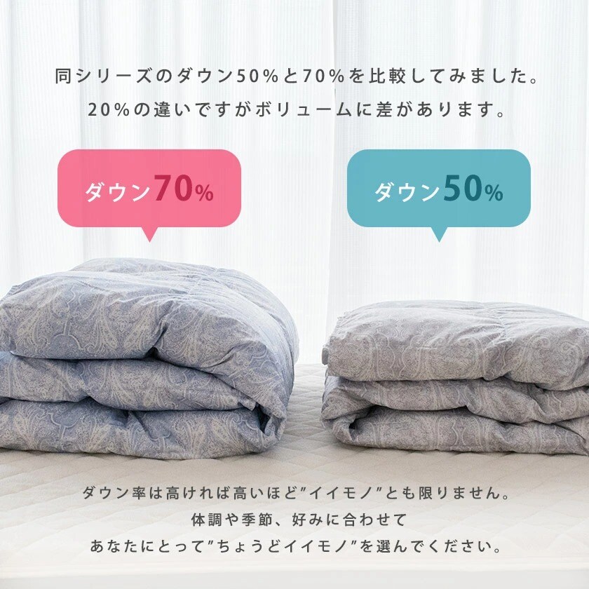 | ダウン率70%はダウンケットでもスタンダードな仕上がりで、ちょうどよく使える季節が長いタイプになります。 |