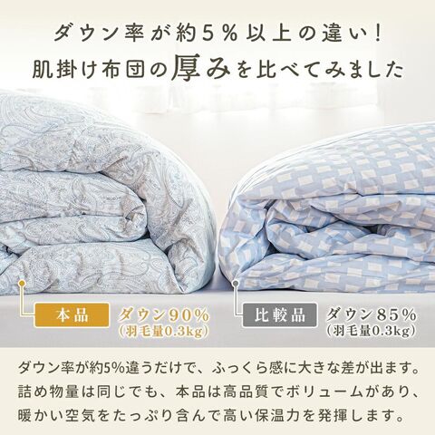 | 組成 | ふとんがわ:ポリエステル85%、再生繊維(リヨセル)15% 詰め物:ダウン90%、フェザー10% |