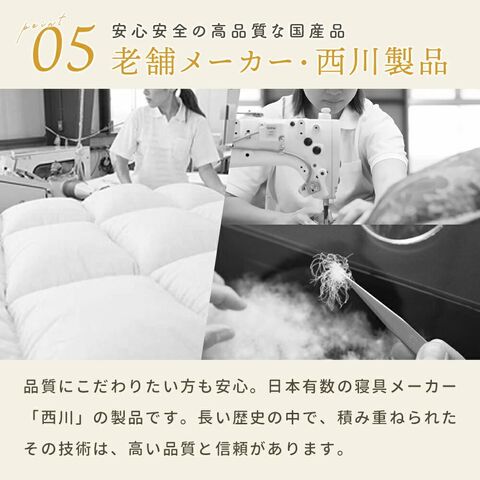 | ・「夏」はこれ一枚で使える!年中使えるちょうどいい薄手の羽毛布団 春から秋まで活躍する程よいボリューム感。天然素材の心地よいぬくもりで、快適な睡眠をサポートします。使い勝手が良く、万能な一枚です。 ・ダウン90%で詰め物量0.3kg!薄手でも適度な保温力軽やかな掛け心地と確かな暖かさを実現。薄手ながらも、優れた保温性を発揮。薄手でもしっかりとした保温力を求める方や、エアコンの寝冷え対策などにおすすめです。 ・オフシーズンは、かさばらずスマートに!コンパクトに収納できます!使わない季節は、コンパクトに畳んですっきり収納。クローゼットの中でも場所を取らず、片付けもラクラクです。 ・環境に配慮した再生繊維生地。軽やか&柔らかさをプラス軽くて柔らかな再生繊維(リヨセル)に、丈夫なポリエステルを配合し、さらなる耐久性をプラスしました。優れた吸湿性と通気性を兼ね備えました。 ・安心安全の高品質な国内品、老舗メーカー・西川製品品汁にこだわりたい方も安心。日本有数の寝具メーカー「西川」の製品です。長い歴史の中で、積み重ねられたその技術は、高い品質と信頼があります。 ・長く使えて、1年中暖かな快適さ続く。合い掛け布団とセット使いがおすすめ合い掛け布団と肌掛け布団を重ねることで、贅沢なボリュームに!寒い冬でも使える2枚合わせの掛け布団に変身し、1年中快適さが続き、長くお使いいただけます。 ※合い掛け布団や、2枚合わせセットは別ページでの販売になります。 | |