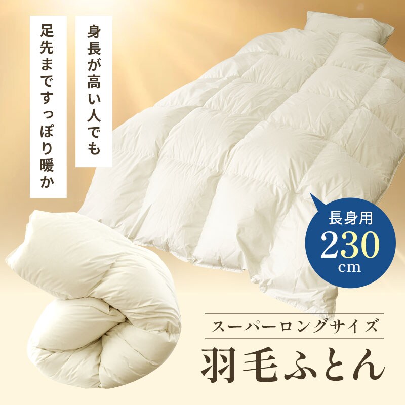身長180cm以上の長身の方にオススメ!丈230cmで足先まですっぽり暖か、スーパーロングサイズの羽毛布団。