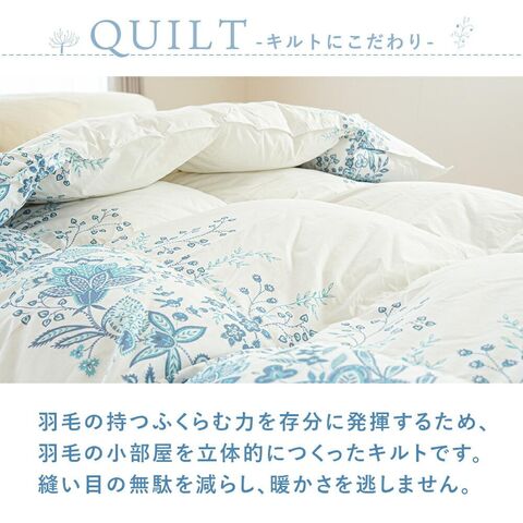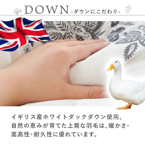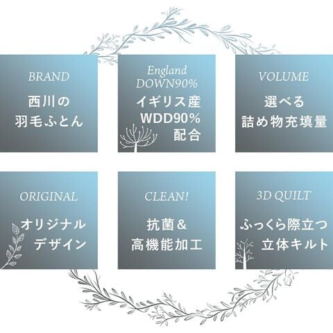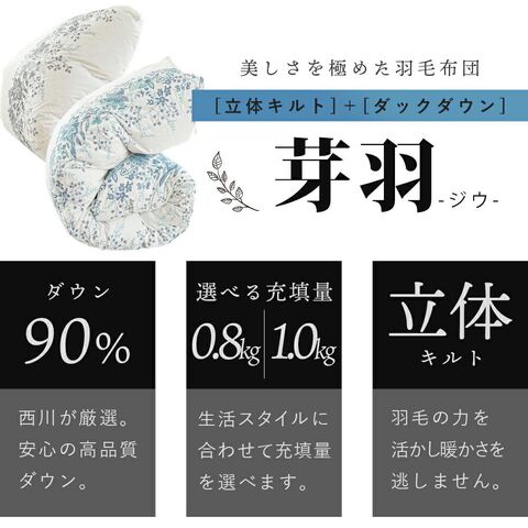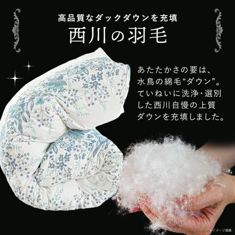 | 仕様 | 選べる充填量 イギリス産ホワイトダックダウン 立体キルト ダウンプルーフ加工 西川のバイオアップ(R)加工 抗菌加工 ループ8ヵ所 二重縫製 4×5マスキルト |