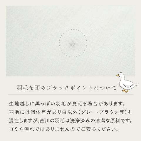 | その他注意 | ■羽毛の臭いに関してのご注意を必ずお読み下さい。 ■ポリエステルを使用した側生地について必ずお読みください。 ■羽毛布団のブラックポイントについてのご注意を必ずお読み下さい。 ■できるだけ実物と同じ色合いになるよう徹底していますが、ご使用の端末やブラウザなどにより実物と色合いが異なって見える場合がございます。 ■重さの表記をしておりますが、およその値です。わずかですが個体差があることをご考慮下さいませ。 ■商品のサイズ・重量は約表記です。サイズ・重量を保証するものではございませんのでご了承ください。 ■2025年9月より、詰め物の量を減らし、一部仕様を変更して再販しております。 |