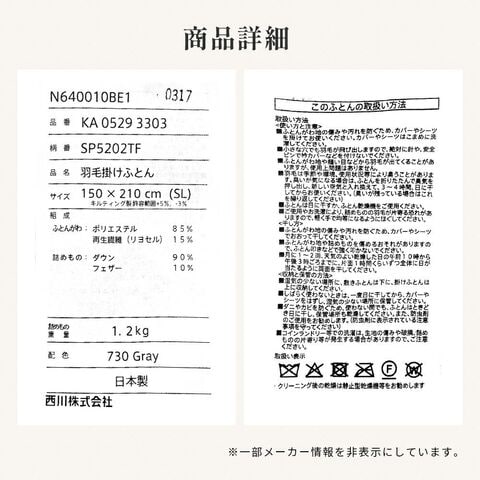 | 組成 | ふとんがわ:ポリエステル85%、再生繊維(リヨセル)15% 詰めもの:ダウン90%、フェザー10% |