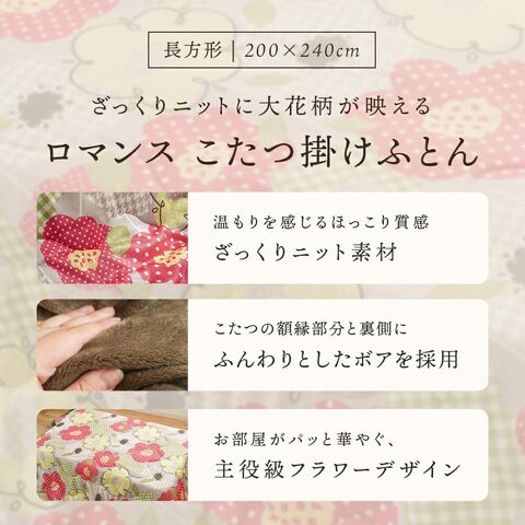 | ・在庫限りでお買い得 冬のくつろぎにふさわしい、ロマンスの上質な一枚を在庫限りで。半額の今が、いちばん心強い買い時です。 ・ロマンス小杉のこたつ掛け布団ざっくりニットに大花柄が映える、ふわボア仕立てのカジュアルなロマンスのこたつ掛け布団。高い技術と品質で、どなたにでも安心してお使いいただける商品です。 ・ほっこり質感のニット素材表面はざっくり編みのニット調。セーターのようなあたたかみと柔らかな手ざわりで、触れた瞬間からほっと和むぬくもりを届けます。 ・額と裏側にふんわりとしたボアを採用額縁と裏面には、やわらかなボアを採用。触れた瞬間からぬくもりが広がります。 ・お部屋がパッと華やぐ、カジュアルなフラワー柄大胆な大花を散りばめ、落ち着いたトーンでまとめたカジュアルデザイン。冬のリビングを明るく彩ります。 | |