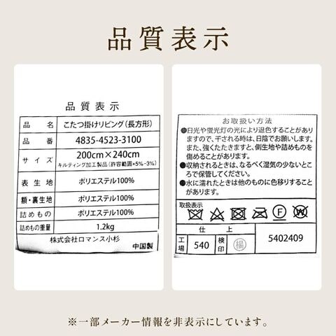 | サイズ | 約200×240cm(長方形)キルティング加工製品(許容範囲+5%-3%) |