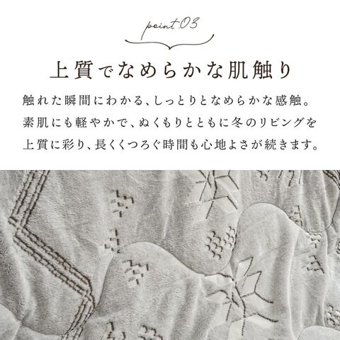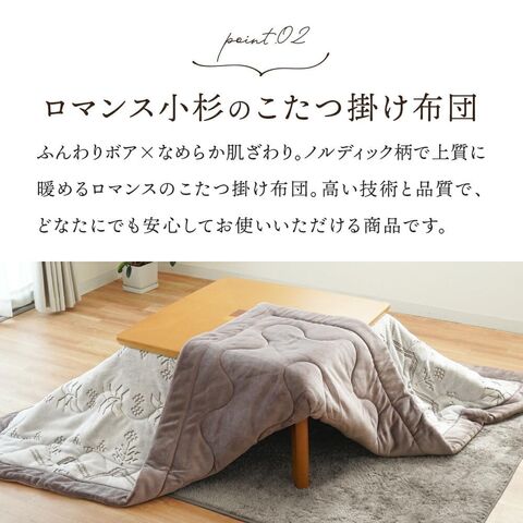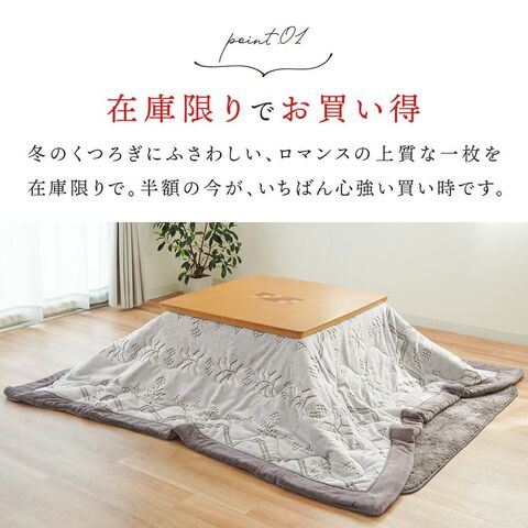 | ・在庫限りでお買い得 冬のくつろぎにふさわしい、ロマンスの上質な一枚を在庫限りで。半額の今が、いちばん心強い買い時です。 ・ロマンス小杉のこたつ掛け布団ふんわりボア×なめらか肌ざわり。ノルディック柄で上質に暖めるロマンスのこたつ掛け布団。高い技術と品質で、どなたにでも安心してお使いいただける商品です。 ・上質でなめらかな肌触り触れた瞬間にわかる、しっとりとなめらかな感触。素肌にも軽やかで、ぬくもりとともに冬のリビングを上質に彩り、長くくつろぐ時間も心地よさが続きます。 ・額と裏側にふんわりとしたボアを採用額縁と裏面には、やわらかなボアを採用。触れた瞬間からぬくもりが広がります。 ・あたたかみのあるキルティング 雪のようなノルディック柄白を効かせたノルディックモチーフが、雪の結晶のようにさりげなく。上質な北欧テイストを演出します。 | |