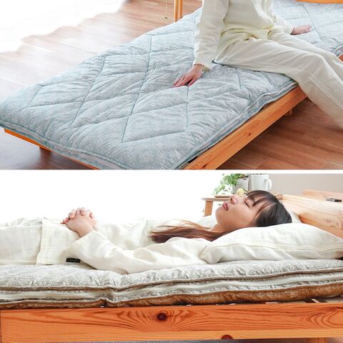 | ・ご家庭で簡単に、着脱もらくちん洗える側生地は清潔で安心 洗うを身近に。家庭洗濯機OK!汗・皮脂の汚れやニオイが毎日蓄積される敷布団を洗ってリセット 洗うことによって、ダニやカビを除去・繁殖を抑え、アレルギー対策にも効果的!洗える敷布団です。 ・極厚だからヘタりにくい厚みしっかり約10cm厚さ約10cmのボリュームで安定した寝心地。 ベッドでの使用はもちろん、フローリングや畳でも問題なく快適にお使いいただけます。 ・底つき感なく安定感◎身体を支える三層構造しっかり硬さのある固わたをボリューム感のあるテイジンまもらいふ®わたでサンドすることで、沈み込みを抑えしっかり身体を支えてくれます。 ・寝心地のよいボリューム中空わたでふっくらかさ高繊維の中が空洞になった中空構造と、3次元「スパイラル構造」により、ふっくらとしたかさ高性を実現します。 ・360度ファスナーで取り付け・取り外し簡単360度ファスナーで敷き布団を一人で簡単に3分割できます ・長持ちしやすいダイヤキルト細かいダイヤ型のキルティングで中わたの片寄りを防ぎ、ボリューム感を維持。 ・ホコリが出にくいポリエステル生地ポリエステル繊維はホコリが出にくいのでアレルギーのある方でも安心です。 | |