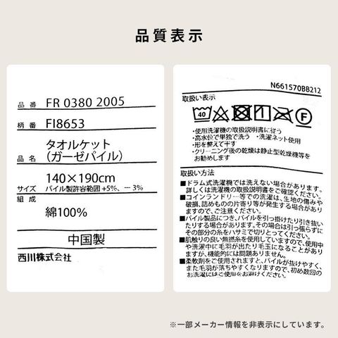 | その他注意 | ■洗濯の際は、タグなどに表記されている内容を必ず確認してから行ってください。 ■洗濯機をご使用される場合は、必ず洗濯機の取扱説明書に従ってください。 ■できるだけ実物と同じ色合いになるよう徹底していますが、ご使用の端末やブラウザなどにより実物と色合いが異なって見える場合がございます。 ■重さの表記をしておりますが、およその値です。わずかですが個体差があることをご考慮下さいませ。 ■商品のサイズ・重量は約表記です。サイズ・重量を保証するものではございませんのでご了承ください。 |