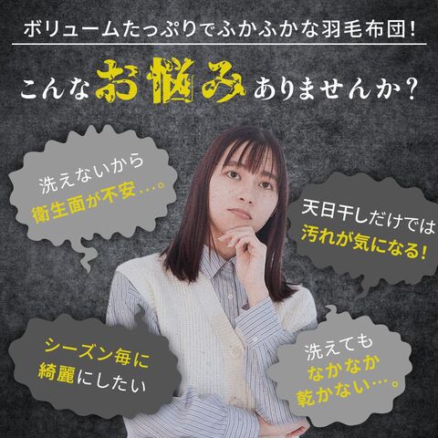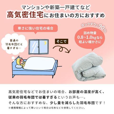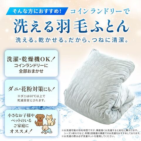| その他注意 | ■お洗濯可能の羽毛布団ですが、頻度高くお洗濯すると劣化に繋がります。シーズン終わりなど、年間1回程度の頻度でのお洗濯をおすすめしております。 ■洗濯の際は、タグなどに表記されている内容を必ず確認してから行ってください。 ■側生地から透けて見える黒点(ブラックポイント)について。黒っぽい羽毛が生地から透けて見える場合がございます。洗浄した清潔な羽毛であり、ごみや汚れではありませんので安心してお使いください。 ■できるだけ実物と同じ色合いになるよう徹底していますが、ご使用の端末やブラウザなどにより実物と色合いが異なって見える場合がございます。 ■重さの表記をしておりますが、およその値です。わずかですが個体差があることをご考慮下さいませ。 ■商品のサイズ・重量は約表記です。サイズ・重量を保証するものではございませんのでご了承ください。 ■羽毛の臭いに関してのご注意を必ずお読み下さい。 ■ポリエステルを使用した側生地についてのご注意はこちら。 |