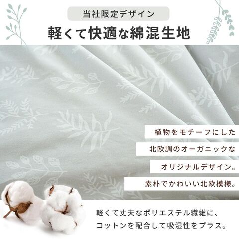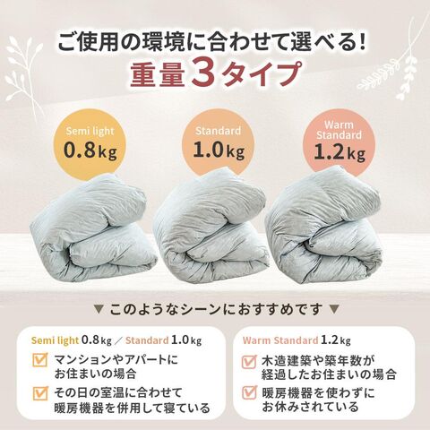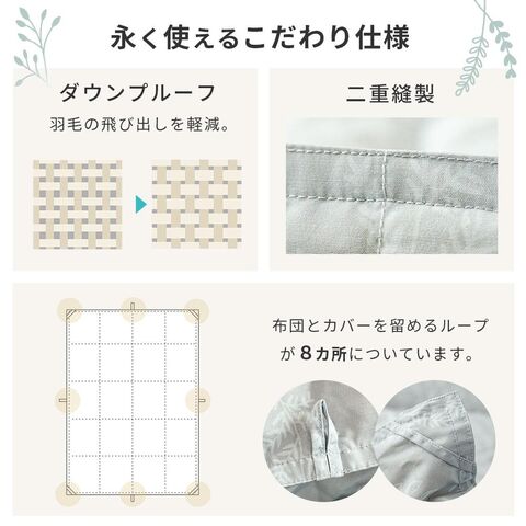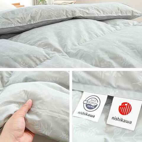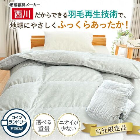 | ・「ecoダウン」で地球にちょっとやさしい選択を ダウン(羽毛)の供給量が減少している現在、限りある資源を守るために羽毛ふとんをリサイクル。不要な羽毛をきれいによみがえらせて再生羽毛布ふとんを製造。企業・地域・私たち一人ひとりの協力で、SDGsにもつながる環境にやさしい取り組みです。 ・コインランドリー対応で乾きやすく、快適に使える洗えるキルトコインランドリーで洗濯ができる特殊構造のキルト。乾きやすく、体に当たる縫い目が少ないため熱を逃がさず、羽毛の片寄りもしにくい快適設計です。 ・ご使用の環境に合わせて選べる重量3タイプマンションや新築一戸建てなどの高気密住宅では、お部屋の湿度が高く、従来の羽毛布団では暑すぎるという声も。そんな方には、詰め物量を少し減らした0.8kg・1.0kg入りの羽毛布団がおすすめです。増量1.2kgタイプは寒がりの方、暖房機器を使わずにお休みされている方にも。 ・はじめての羽毛布団にもおすすめ!再生羽毛のecoダウンを使用ふっくらあたたかいダウン率90%。芯がなくふわふわのダウン(羽毛)で快適な寝心地。新毛よりも洗浄の回数が多いため、清潔で臭いの少ないダウンに仕上がっています。 ・再生羽毛でも安心!より美しく、国内洗浄業界水準の2倍、洗浄度1000mmの高水準で仕上げた清潔な羽毛を使用。汚れや脂分をしっかり落とし、快適でにおいの少ない羽毛本来のふくらみを実現します。 ・創業450年以上の信頼。安心の高品質、西川製品西川の厳しい基準のもと、羽毛布団から取り出したダウンをリサイクル・洗浄して使用。長年の信頼と実績に支えられた高品質なものづくりで、安心して使える商品です。 ・当社限定デザイン!軽くて快適な綿混生地植物をモチーフにした北欧調のオーガニックなオリジナルデザイン。ポリエステル繊維にコットンを配合して吸湿性をプラス。素朴でかわいい北欧模様が魅力です。 | |
