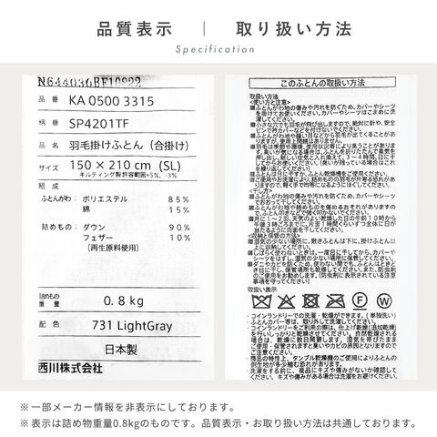 | 組成 | ふとんがわ: ポリエステル85%・綿15% 詰めもの: ダウン90%・フェザー10% (再生原料使用) 詰め物重量:0.8kg |