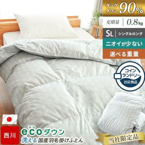 【12/3~12/15迄10%OFFクーポンあり】 西川 羽毛布団 シングル コインランドリー対応 洗える シングルロング 150×210cm 国産 ecoダウン日本製 ダックダウン90% (0.8kg/合掛けふとん)【5S-KA05003315LGY】