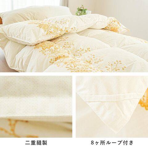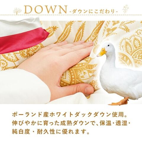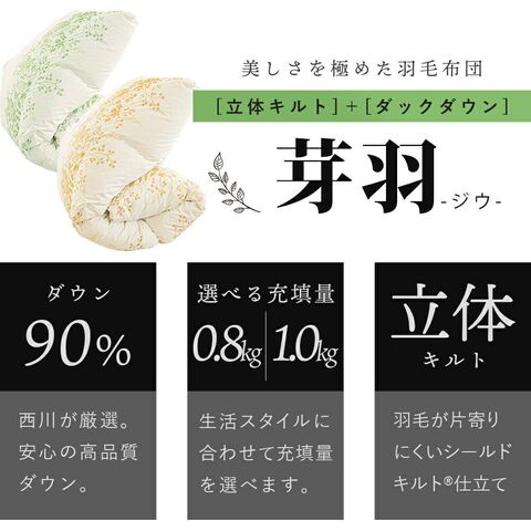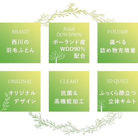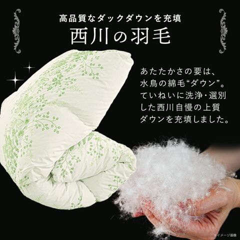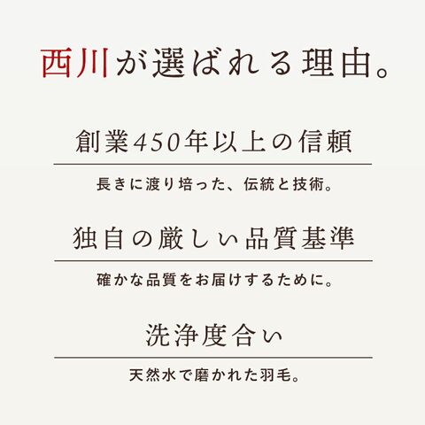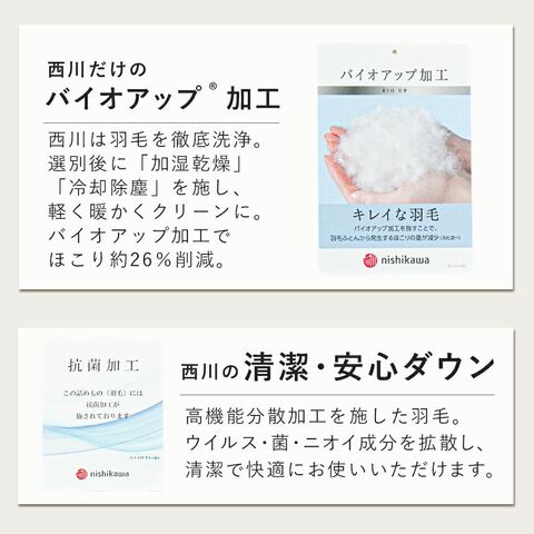 | 仕様 | 選べる充填量 ポーランド産ホワイトダックダウン シールドキルト(R)採用 立体キルト ダウンプルーフ加工 西川のバイオアップ(R)加工 抗菌加工 ループ8ヵ所 二重縫製 4×5マスキルト |