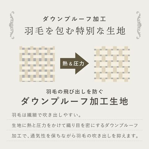 | DOWN -ダウンにこだわり- ポーランド産ホワイトダックダウン使用。伸びやかに育った成熟ダウンで、保温・透湿・純白度・耐久性に優れます。 西川だけの バイオアップ? 加工西川は羽毛を徹底洗浄。選別後に「加湿乾燥」「冷却除塵」を施し、軽く暖かくクリーンに。バイオアップ加工でほこり約26%削減。 西川の 清潔・安心ダウン高機能分散加工を施した羽毛。ウイルス・菌・ニオイ成分を拡散し、清潔で快適にお使いいただけます。 QUILT -キルトにこだわり-シールドキルト?を採用。羽毛が片寄りにくい、L字型のマチを備えた立体キルトです。マス間の片寄りを防ぎ、均一なぬくもりをキープ。 立体キルト羽毛の良さを引き立てるマチのあるキルティング。肌沿いが良く、暖かい空気を逃がしにくいので快適。マチで小部屋をつくり羽毛の片寄りを抑制。表裏を密着させない特殊縫製で、ふっくら感が続きます。 CLOTH -生地にこだわり-軽さと張り感に自信。それでも羽毛は通しません。 ダウンプルーフ加工 羽毛を包む特別な生地羽毛の飛び出しを防ぐダウンプルーフ加工生地。羽毛は繊細で吹き出しやすい。生地に熱と圧力をかけて織り目を密にするダウンプルーフ加工で、通気性を保ちながら羽毛の吹き出しを抑えます。 ・西川製品西川は、日本有数の寝具メーカー。1566年創業。450年という長い歴史があり、その中で培ってきた伝統や技術に準ずる品質の高さは類を見ません。安心できる寝具を選びたいのならメーカーで選んでみるのも◎ | |