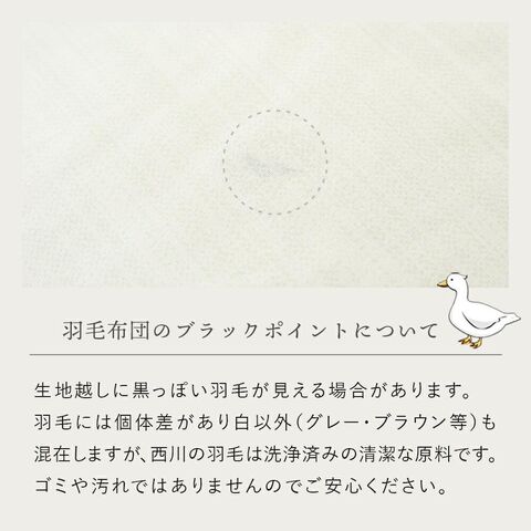 | その他注意 | ■2025年9月より色展開と一部仕様を変更して再販しております。 ■羽毛の臭いに関してのご注意を必ずお読み下さい。 ■ポリエステルを使用した側生地について必ずお読みください。 ■羽毛布団のブラックポイントについてのご注意を必ずお読み下さい。 ■できるだけ実物と同じ色合いになるよう徹底していますが、ご使用の端末やブラウザなどにより実物と色合いが異なって見える場合がございます。 ■重さの表記をしておりますが、およその値です。わずかですが個体差があることをご考慮下さいませ。 ■商品のサイズ・重量は約表記です。サイズ・重量を保証するものではございませんのでご了承ください。 |